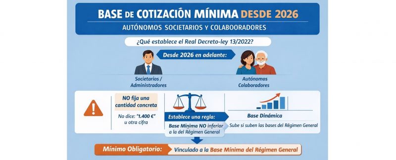A partir de 2026, la base mínima de cotización de los autónomos societarios y colaboradores no queda fijada en una cuantía concreta, sino que no podrá ser inferior a la base mínima del Régimen General de la Seguridad Social (Grupo 7), configurándose como un mínimo dinámico vinculado a dicho régimen, ya que no existe una prórroga formal de la base mínima de 1.000,00 €.